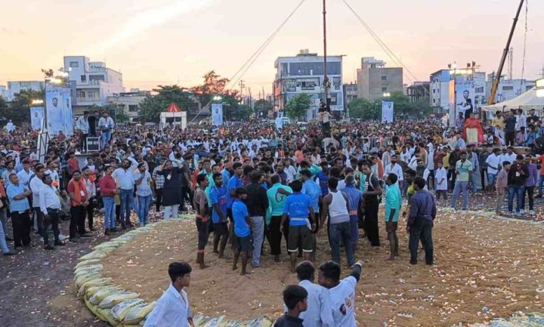 रायपुर। हर साल की तरह इस साल भी राजधानी में गुढ़ियारी के हनुमान मंदिर स्थित दही-हांडी मैदान में सबसे बड़ा मटकी फोड़ का आयोजन हुआ। पिछले 13 सालों से लगातार हो रहा है। इस बार झारखंड, महाराष्ट्र, मध्यप्रदेश सहित कई राज्यों के लगभग 26 टोलियाें ने हिस्सा लिया। विजेता टोली को प्रथम इनामी राशि 5 लाख 71 हजार रुपए दिया गया।